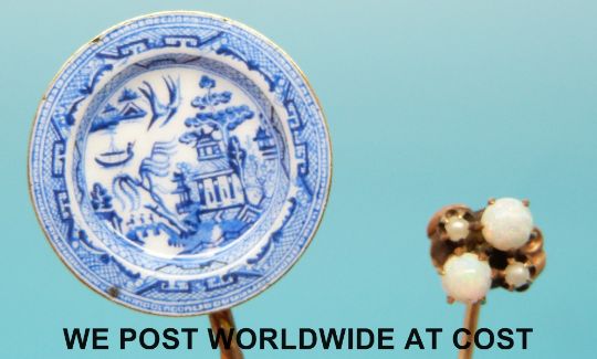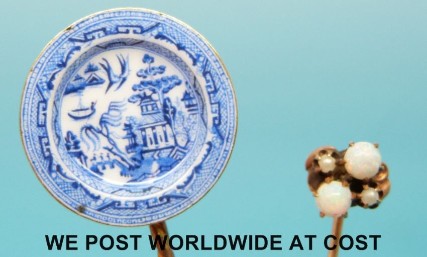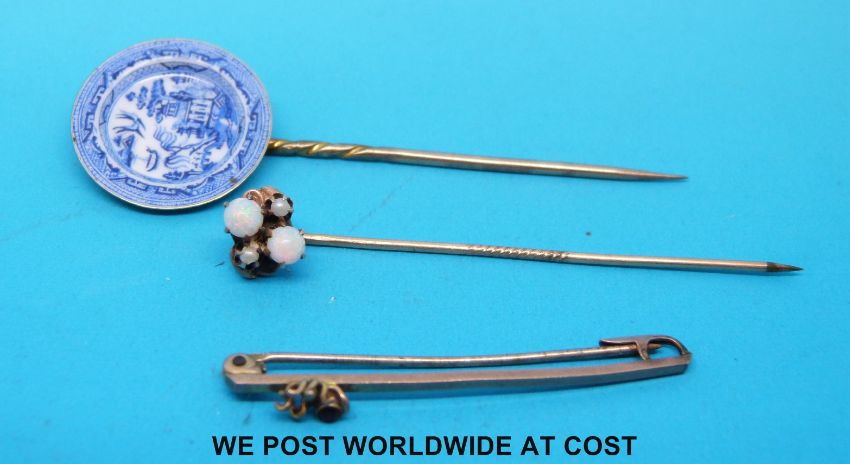 A 9ct gold brooch set with a garnet to depict a spider, a yellow metal stick pin set with opals and another set with a miniature enamel willow pattern plate