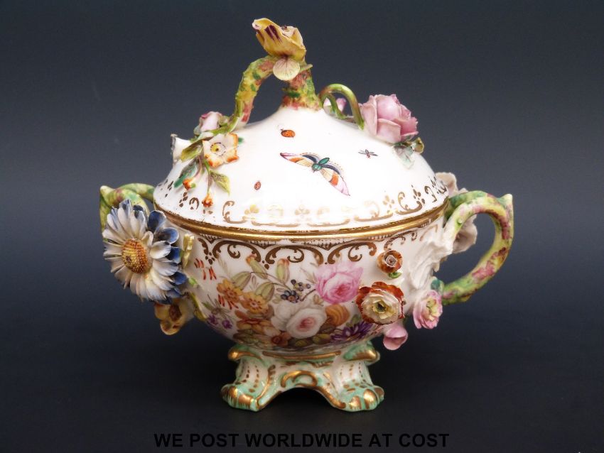 An early 19thC Coalbrookdale or early Coalport twin handled lidded sucrier finely decorated with insects and applied flowers (12.5cm tall)