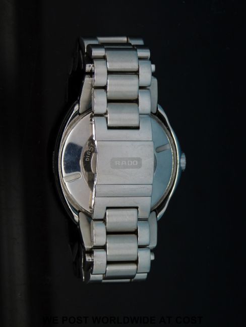 Rado Over Pole gentleman's automatic wristwatch with bevelled glass two-tone face and white markers, in stainless steel case, on matching bracelet, case diameter 38mm, with original warranty and leather wallet.