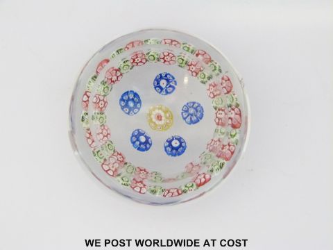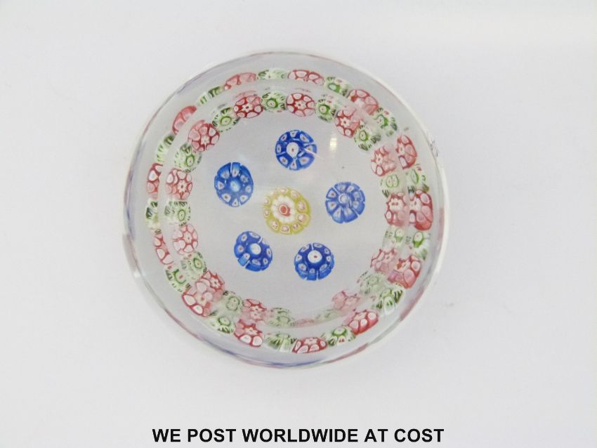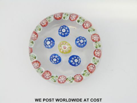 St Louis rondello patterned millefiori glass paperweight with central red, white and yellow canes surrounded by five roundel's of blue and white canes and an outer ring of red and white canes interspersed with green and blue canes, 63mm in diameter