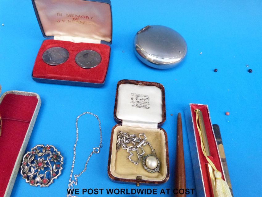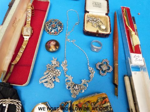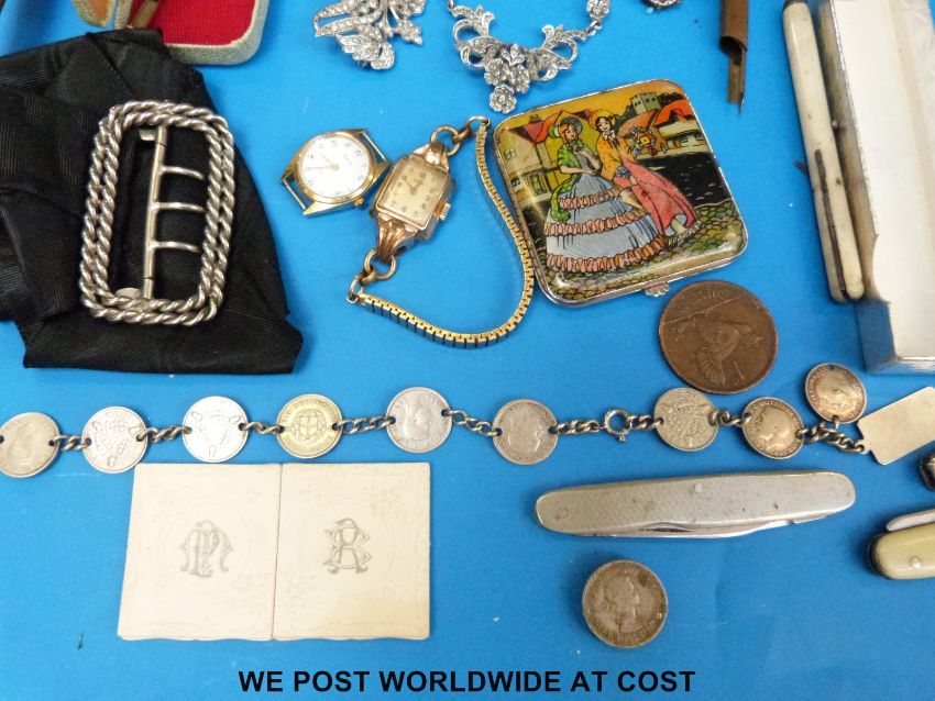 A micro mosaic brooch, marcasite necklace, a silver brooch, watches, penknives, coin bracelet, brooches etc