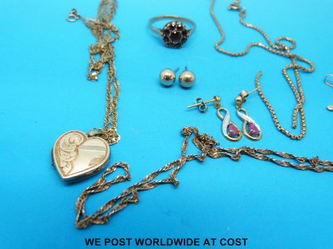 A collection of 9ct gold to include a ring set with garnets in a cluster, three chains, a cross pendant, two heart lockets, and two pairs of 9ct gold earrings, one pair set with rubies and diamonds (14.9g)
