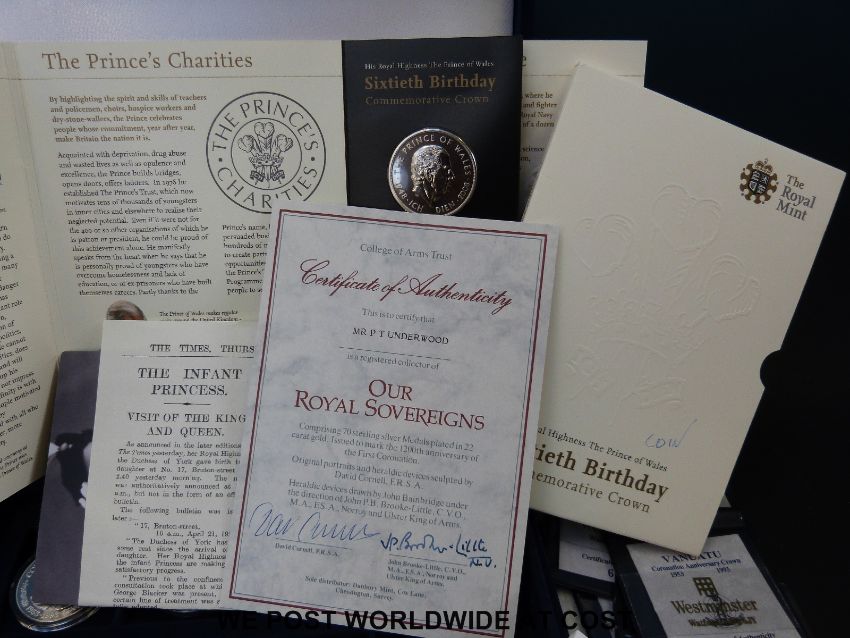 Nine silver crown sized Royal commemorative coins in a Westminster case, to include Coronation anniversary, Jersey, Seychelles, Tonga etc (with certificates)