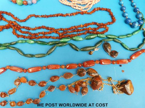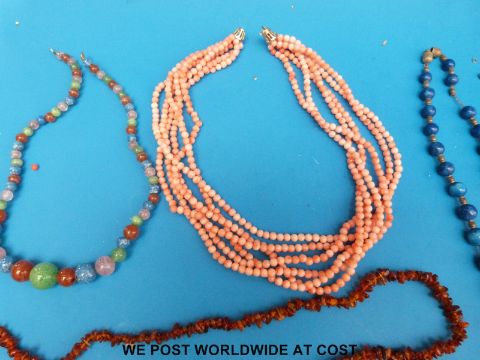 A collection of necklaces to include six strand coral necklace, lapis lazuli, two malachite examples, carnelian agate, amber etc.