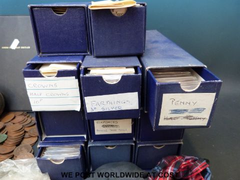 A large amateur collection of UK coinage in the whole, includes early examples George IV onwards, all denominations represented, mainly individually packaged and catalogued, many consecutive with silver content, half crowns etc
