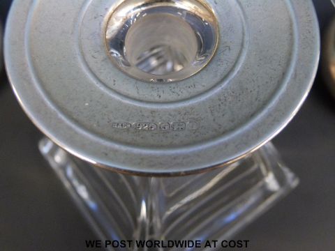 Two silver-mounted glass candle holders, tallest 10cm, and a silver-mounted glass scent bottle