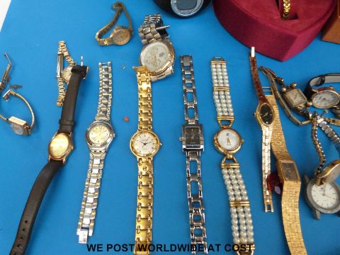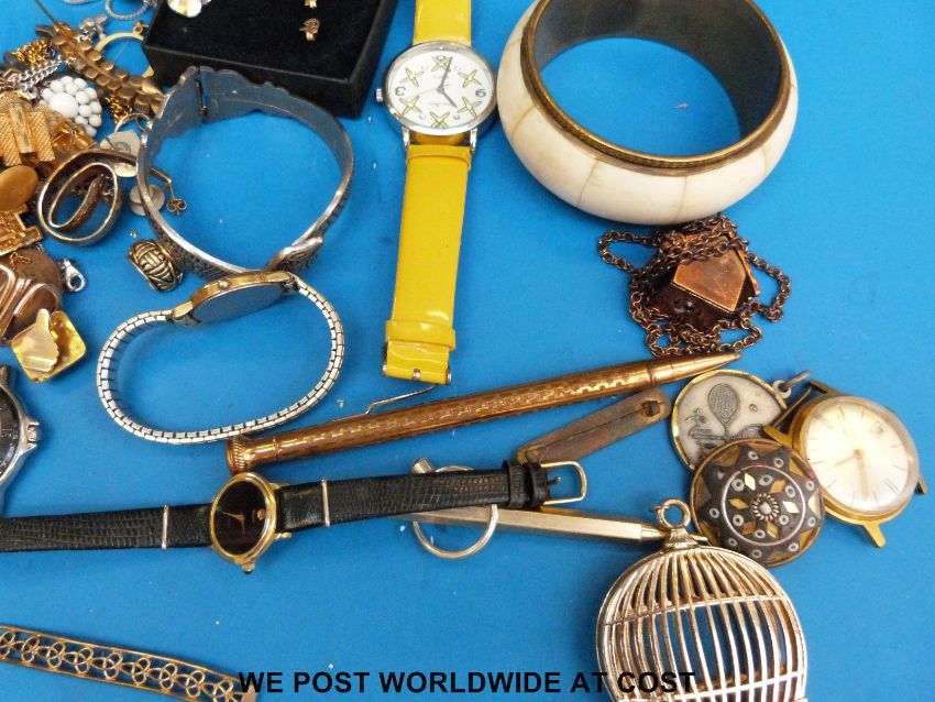 A collection of costume jewellery to include bracelets, necklaces, watches, diecast toys, 9ct gold watch, coins etc