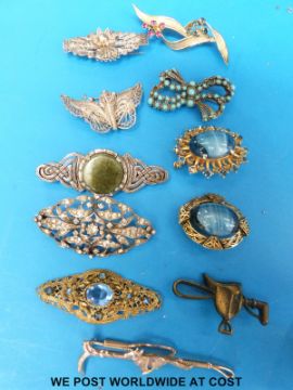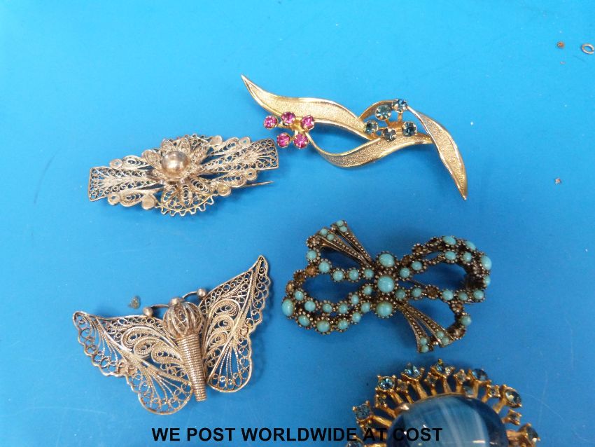 A collection of brooches to include two filigree, silver and paste, miracle etc.
