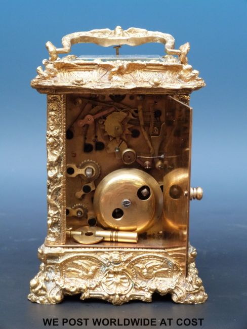 A decorated brass carriage alarm clock with half hour repeater mechanism and alarm striking on a bell, enamelled dial, seconds sweep and trefoil pierced hands