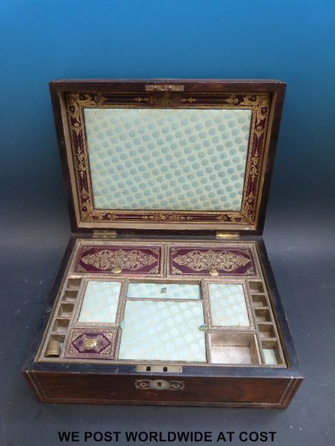 A 19thC rosewood and mother of pearl inlaid sewing or jewellery box with fitted interior, width 30cm