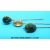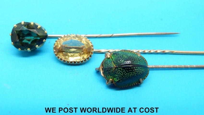 A yellow metal stick pin set with a scarab beetle, and two yellow metal stick pins set with citrine and peridot