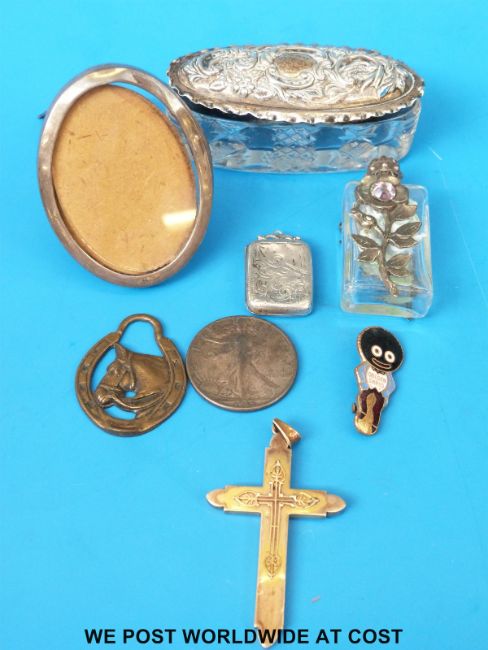 A yellow metal cross, hallmarked silver photo frame, hallmarked silver locket, Golly badge etc