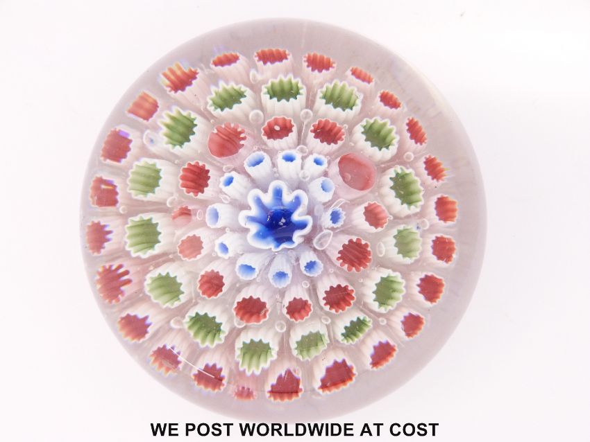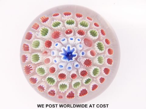 An Old English patterned millefiori glass paperweight with central star shaped blue and white canes surrounded by four bands of blue, white, pink and green canes, 86mm in diameter