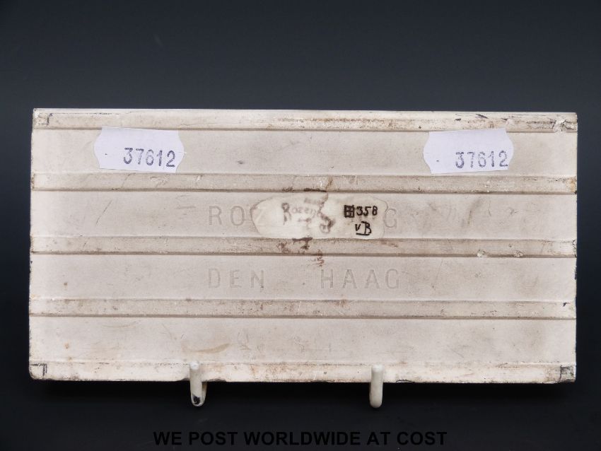 Rozenburg den Haag hand painted ceramic tile, signed bottom left, depicting a Dutch scene of windmills by a river, marked to the back 358 VB (8 x 16cm)