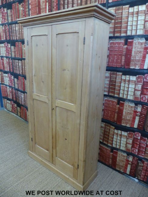 A pine housekeeper's or similar cupboard, the panelled doors opening to reveal shelves (width 103cm, depth 35cm, height 178cm)