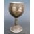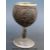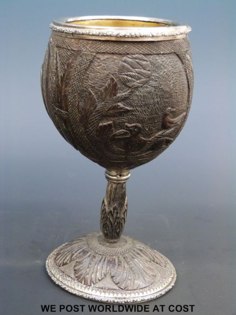 A Victorian carved coconut goblet with hallmarked silver mounts, metal heart emblem, carved figure, dog and bird to body, Ldn 1874, maker William Neal (16.5cm tall)