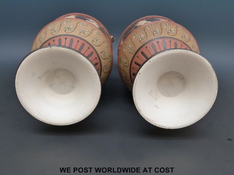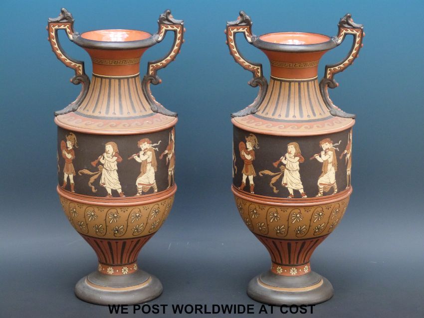 A pair of late 19thC / early 20thC German Mettlach pedestal twin-handled vases with incised decoration of children playing musical instruments and dancing in a continuous band (35cm tall)