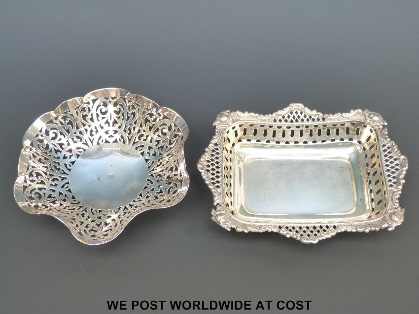 An Edward VII hallmarked silver basket with pierced decoration, 17cm long, Chester 1902, together with a hallmarked silver pierced bon bon dish,15cm diameter, B'ham 1959 (weight of both 219g)
