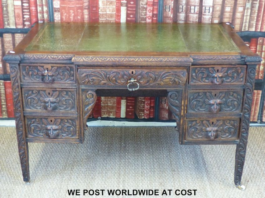 A carved oak desk with mask handles (width 121cm, depth 70cm, heigth 75cm)