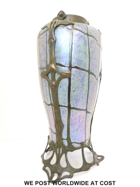 Loetz colbalt Papillon Pampas iridescent glass vase encased in Art Noveau metal mounts 45cm tall