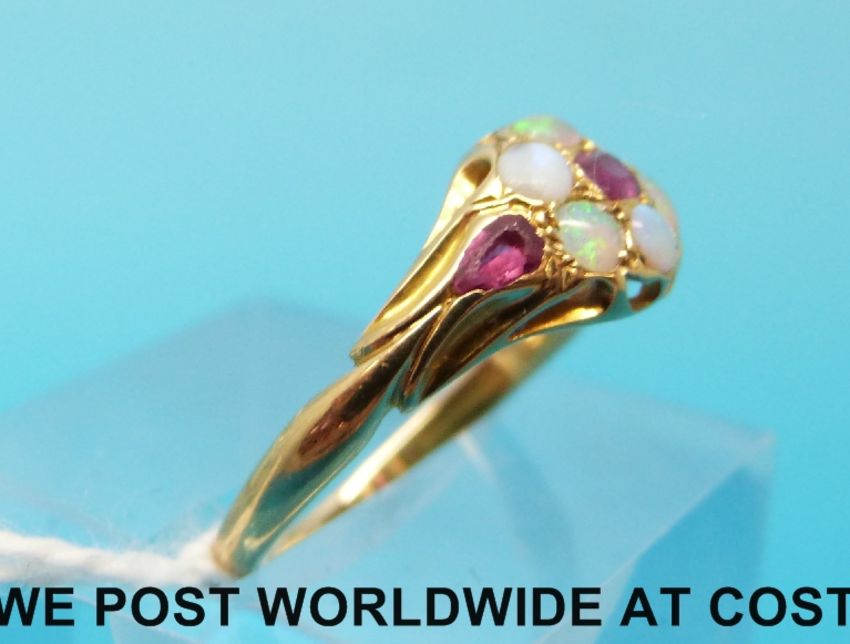 A yellow metal ring set with opals and rubies (size N)