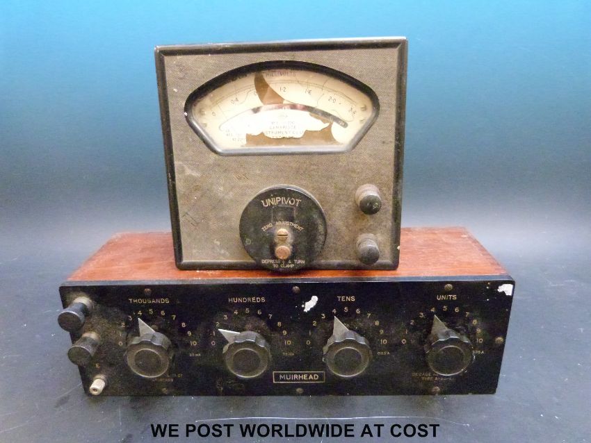 A Decade resistance box, type A-25-L by Muirhead & Co Ltd No. 141959 together with a bakelite cased Unipivot amp meter