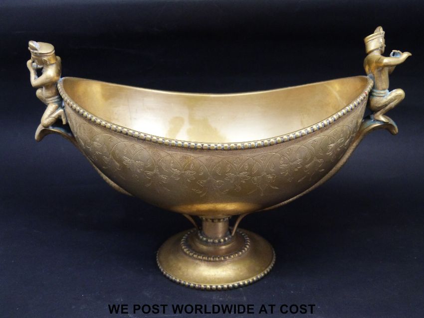 A 'Jeypore School of Arts' (modern day Jaipur) brass figural pedestal bowl, length 20cm