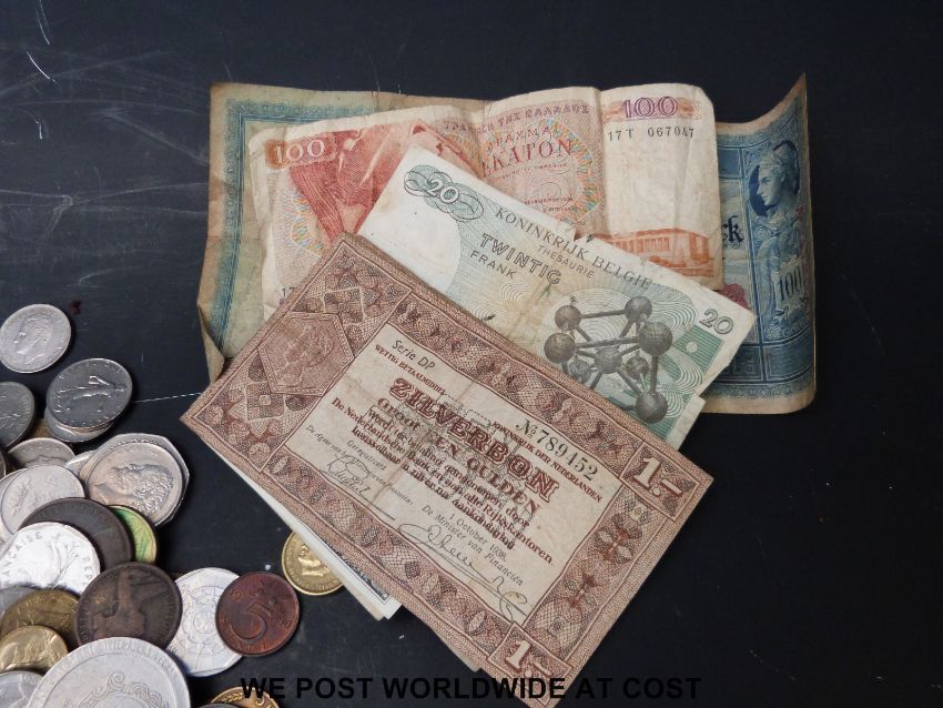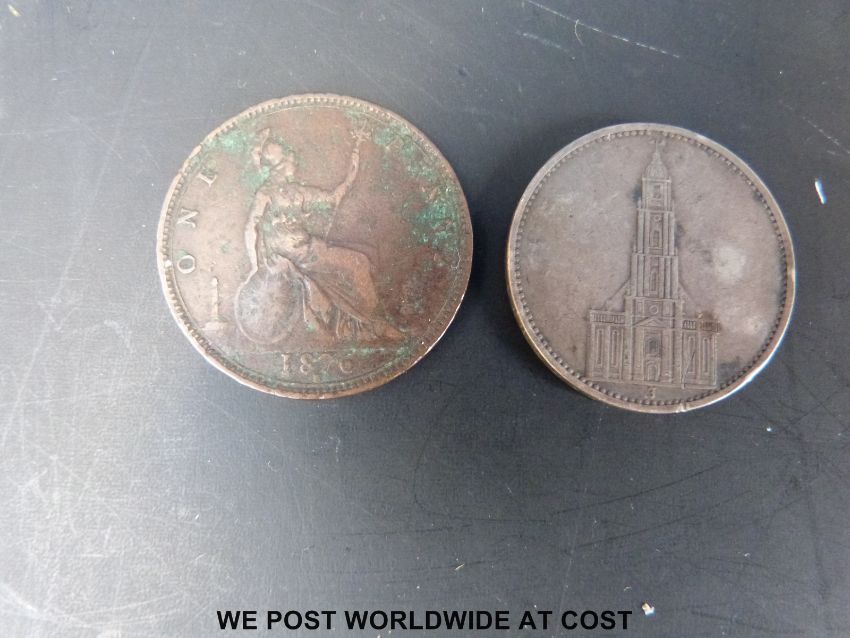An amateur collection of overseas and some UK coinage, Victoria young head onwards includes small silver content, 1934 five Deutsches Reichsmark, and some bank notes