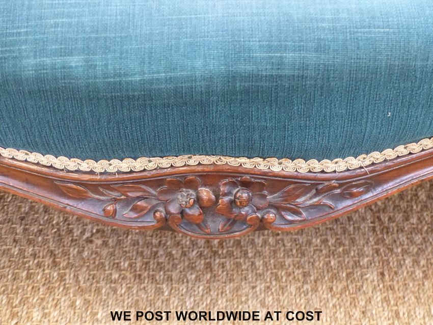 A Victorian conversation settee, the double sided high-backed frame with carved detail leading to a serpentine front with carved floral detail (width 193cm)