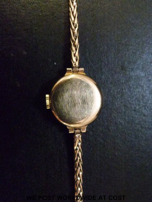 Cyma Cymaflex ladies 9ct gold wristwatch with gold hands and markers on white face, case diameter 17mm (16g)