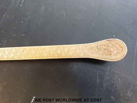 An unusually large Chinese or Canton carved ivory brise fan, the guard sticks with various carved cartouches and fine floral detail to the insides, the finely pierced interior sticks all over decorated with flowers (37.5cm tall)