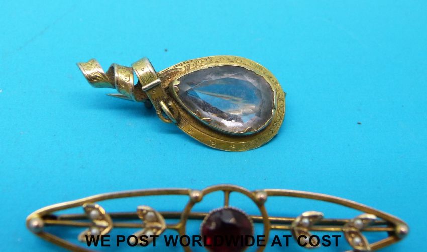 A Victorian brooch set with a quartz, a yellow metal brooch marked 9ct and a 9ct gold brooch set with a garnet and seed pearls