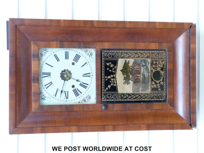 An American Jerome Ogee cased 30 hour wall clock featuring a cottage scene to glass