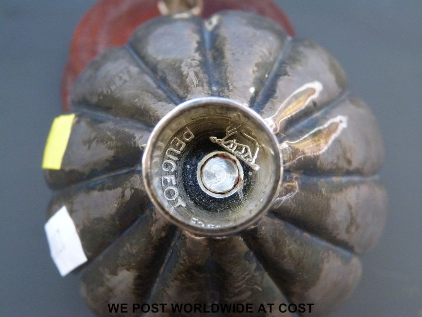 A hallmarked silver pepper grinder by Mark Stevens of Warwick in the form of a hot air balloon, B'ham 1997. According to Millers Guide this is from a limited edition of only seven, one was made in 9ct gold for King Hussain of Jordan and another for Richard Branson. Height on wooden plinth 15cm