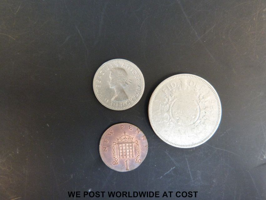 Three unusual "mis-strike" UK coins comprising an Elizabeth II 1966 florin with no milling, a sixpence with obverse brockage and a decimal 1p on a halfpence blank