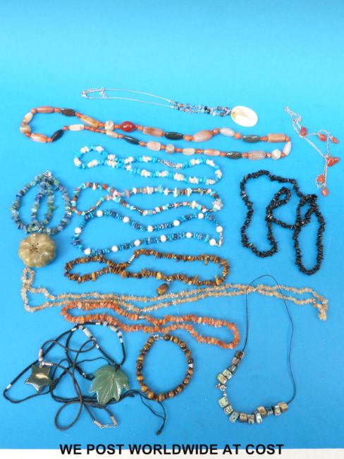 A collection of necklaces including three agate examples, tiger's eye, abalone, lapis lazuli, pearl and a tiger's eye bracelet etc