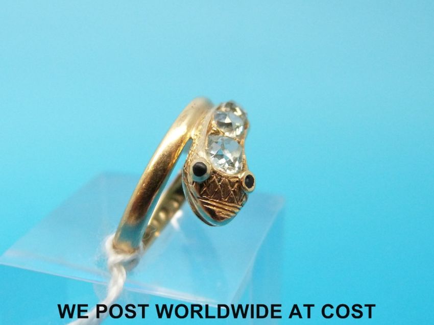 A Victorian ring set with three old mine cut diamonds with a blue hue in the form of a snake with two jet eyes (4.3g)