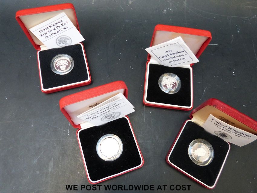 Four £1 silver proof cased and certified Piedfort coins, 1984, 1985, 1988 and 1989