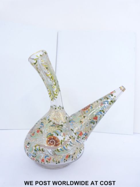 A Spanish glass porro wine pourer with Moser style enameling, 20cm tall