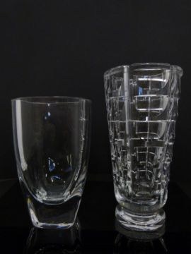 Two Orrefors glass vases, one in the 1000 Windows pattern of tapering form on pedestal foot (28cm tall) the other of graduated form with bevelled rim (23cm tall) both signed to base