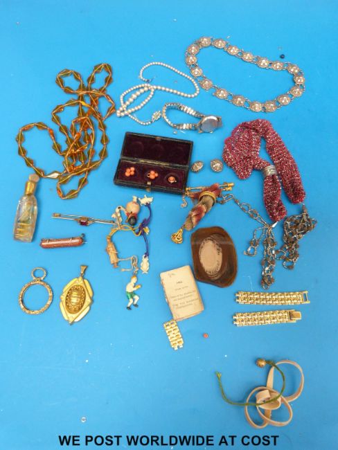 A collection of jewellery to include a white metal necklace, a cut steel miser purse, another purse with thistle decoration, a section of agate, glass necklace, pendant, sun stone brooch etc
