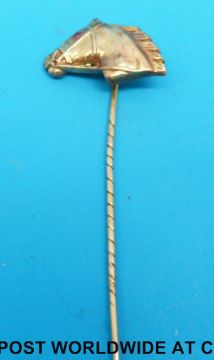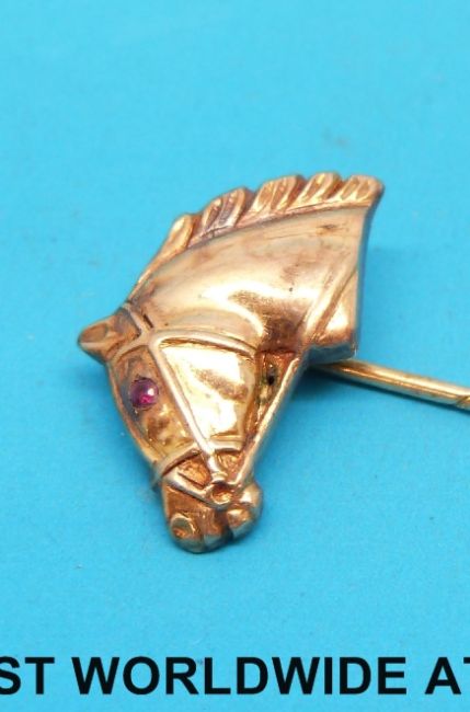 A yellow metal stick pin set in the form of a horse with a ruby eye.