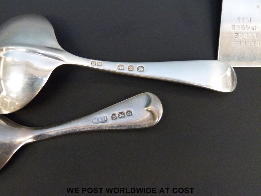 Three late 19thC / early 20thC hallmarked silver caddy spoons and a white metal example marked silver and engraved Barnes Lodge No 4968 1951, possibly Masonic interest
