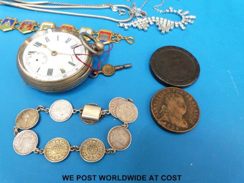 A tin containing costume jewellery to include silver bracelet, yellow metal brooch, two coins, white metal bracelets etc