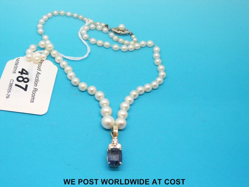 A single strand of pearls with a gold pendant set with a large sapphire and three diamonds