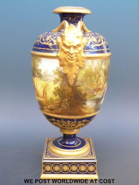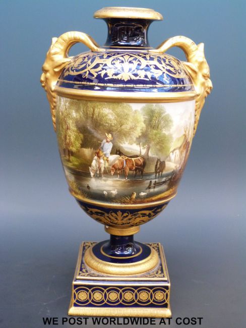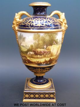 A Copeland pedestal urn decorated with two scenes, one haymaking, the other horses watering (24cm tall)