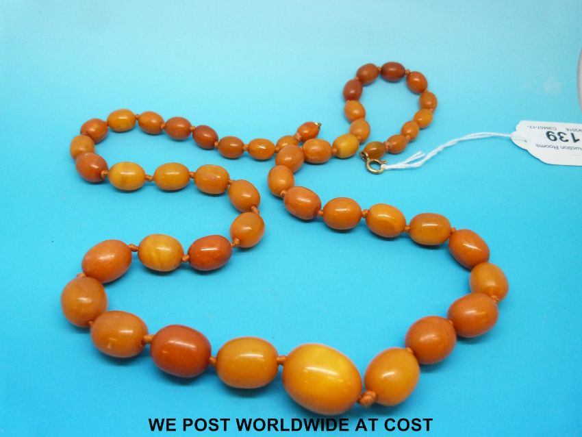 A graduated amber necklace made up of 48 oval beads of butterscotch colour, 44g. Length is 70cm largest bead size is 2.1cm x 1.5cm