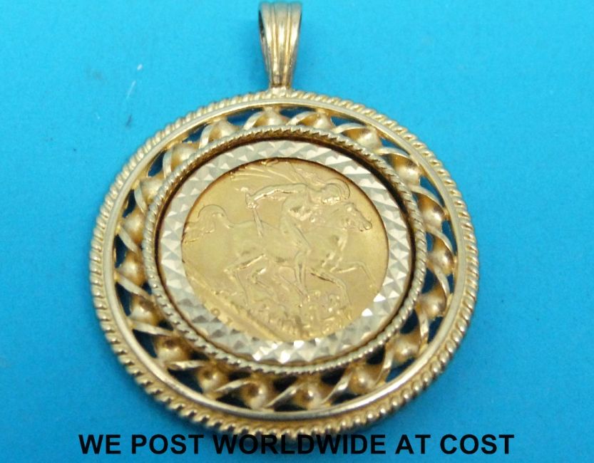 A 9ct gold pendant set with a 1914 gold half sovereign (9.8g)