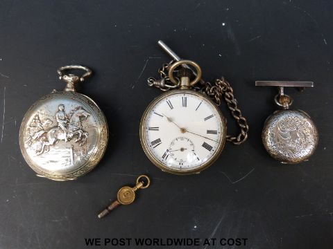 A silver ladies fob watch with an enamel face, a plated pocket watch and a pocket watch with hunting decoration