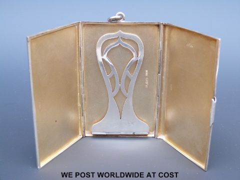 A George V hallmarked silver Art Deco triple folding calling card case, the centre section with spring loaded clip, Chester 1927, maker E J Trevitt & Sons, height 10cm (134g)